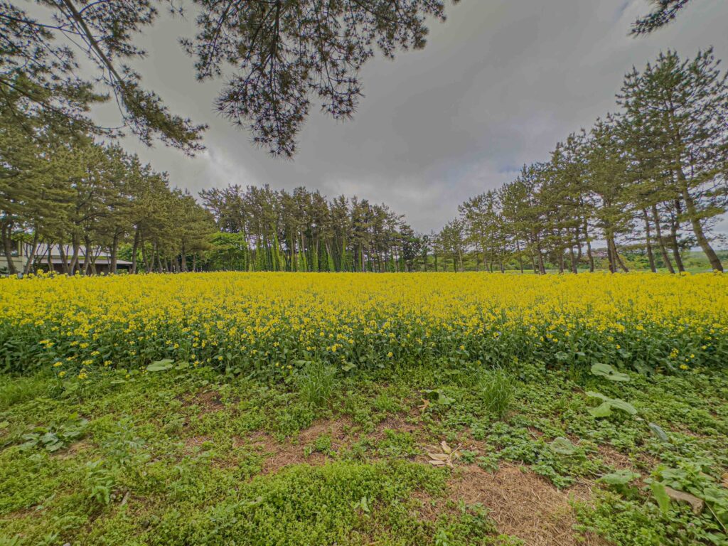 菜の花畑。日本トップレベルの面積らしい。晴れだったらなぁ!