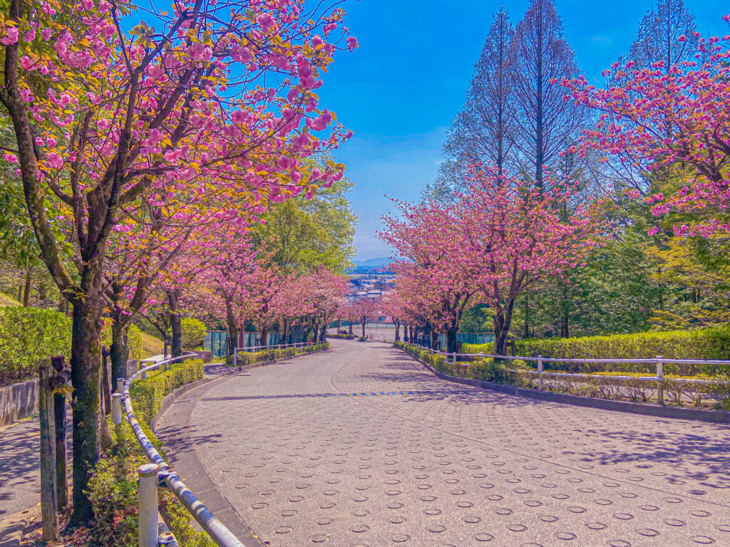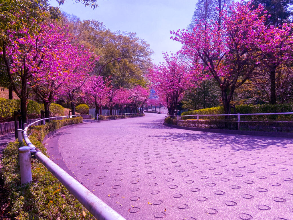 この桜道に植えられている桜は八重桜なので、ソメイヨシノと比べると、開花時期がちょっと遅い。この写真は4月12日に撮影したものだが、満開一歩手前の状態だった。